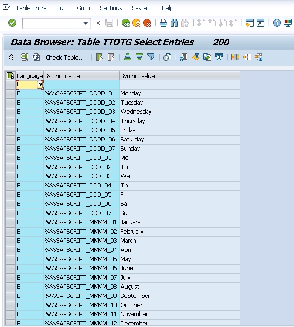 此外,請注意,星期和月份的全稱儲存在表 - “TTDTG” 中,該表是與語言相關的,具有以下鍵 -