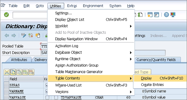 若要查看錶欄位,請導航到 T 碼 SE11 → 輸入表名稱 TTDTG → 顯示