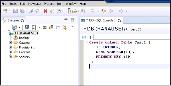 Create column Table Test1 ( ID INTEGER, NAME VARCHAR(10), PRIMARY KEY (ID) );