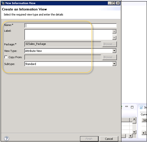 單擊屬性檢視,這將開啟一個新視窗。你需要提供屬性檢視名稱和描述。從下拉列表中,選擇檢視型別和子型別。在子型別中,屬性檢視有三種類型 - 標準、時間和派生。