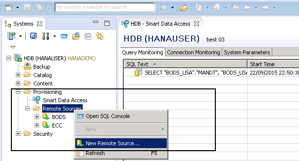 置備選項卡下的智慧資料訪問允許您訪問和分析儲存在其他資料庫系統中的資料,而無需將資料複製到 HANA 資料庫中。資料複製過程總是很耗時,並且需要記憶體儲存。智慧資料訪問允許您建立虛擬表,這些錶鏈接到遠端系統表,並且可以使用這些虛擬表直接在 SAP HANA 系統中訪問資料。