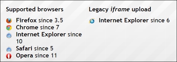 對於跨瀏覽器的HTML檔案上傳器,可以使用FileDrop。它在幾乎所有現代網路瀏覽器中都能正常工作。