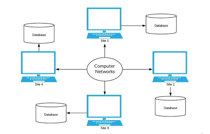 資料庫被劃分到多個位置,並在 Site1、Site2、Site3 和 Site4 儲存資料。