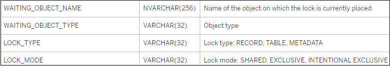 以下資訊可在 SAP HANA M_BLOCKED_TRANSACTIONS 系統檢視中找到
