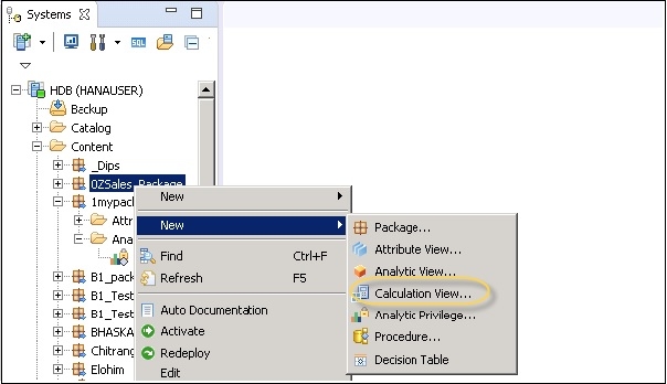 要建立一個計算檢視(SQL 指令碼或圖形檢視),你需要轉到一個 package 並右鍵單擊 → 新建 → 計算檢視