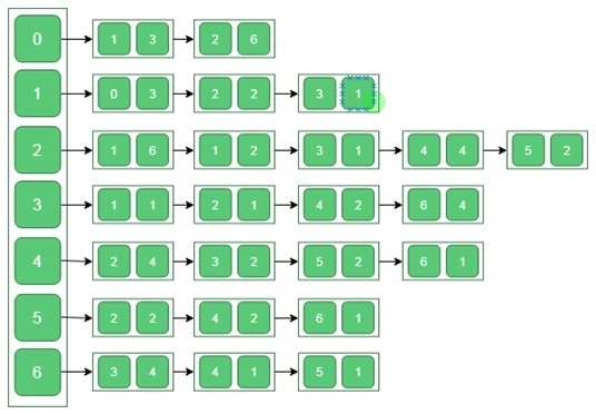 Input: The adjacency list of the graph with the cost of each edge.Output: 0 to 1, Cost: 3 Previous: 0 0 to 2, Cost: 5 Previous: 1 0 to 3, Cost: 4 Previous: 1 0 to 4, Cost: 6 Previous: 3 0 to 5, Cost: 7 Previous: 2 0 to 6, Cost: 7 Previous: 4