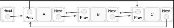 在雙向迴圈連結串列中,尾結點的後指標指向第一結點,而頭結點的指向前指標指向尾結點,這樣就構成了一個雙向迴圈。