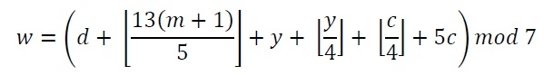 #include<iostream> #include<cmath> using namespace std; string weekday[7] = {"Saturday","Sunday","Monday","Tuesday","Wednesday","Thursday","Friday"}; string zellersAlgorithm(int day, int month, int year) { int mon; if(month > 2) mon = month; //for march to december month code is same as month else { mon = (12+month); //for Jan and Feb, month code will be 13 and 14 year--; //decrease year for month Jan and Feb } int y = year % 100; //last two digit int c = year / 100; //first two digit int w = (day + floor((13*(mon+1))/5) + y + floor(y/4) + floor(c/4) + (5*c)); w = w % 7; return weekday[w]; } int main() { int day, month, year; cout << "Enter Day: "; cin >>day; cout << "Enter Month: "; cin >>month; cout << "Enter Year: "; cin >>year; cout << "It was: " <<zellersAlgorithm(day, month, year); }