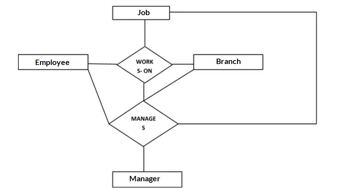 考慮員工、部門和經理之間的三元關係Works_On。現在,模擬這種情況的最佳方法是使用聚合,因此,關係集Works_On是更高層次的實體集。此類實體集與任何其他實體集的處理方式相同。我們可以建立二元關係Manager,在Works_On和Manager之間,以表示誰管理哪些任務。