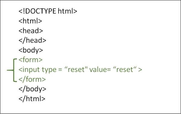 <!DOCTYPE html> <html lang="en"> <head> <meta charset="UTF-8" /> <meta http-equiv="X-UA-Compatible" content="IE=edge" /> <meta name="viewport" content="width=device-width, initial-scale=1.0" /> <title>reset example</title> </head> <body> <form> Enter name:</br> <input type="text" name="input" /></br> Enter Age:</br> <input type="text" name="input1" /></br> <input type="reset" value="reset" /> </form> </body> </html>