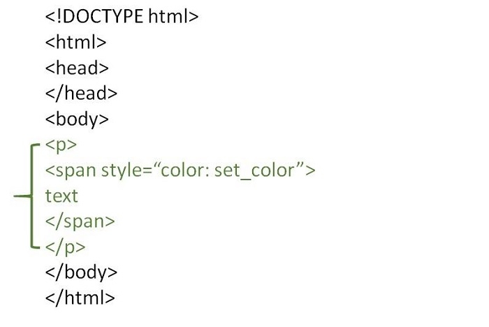 <!DOCTYPE html> <html> <head> <title>HTML span Tag</title> </head> <body> <p>Java is a Programming language widely followed. <span style = "color:#FF0000;">Developed by James Gosling. </span>This is demo text.</p> <p> <span style = "color:#8866ff;"> Current Version: 1.8 </span> </p> </body> </html>