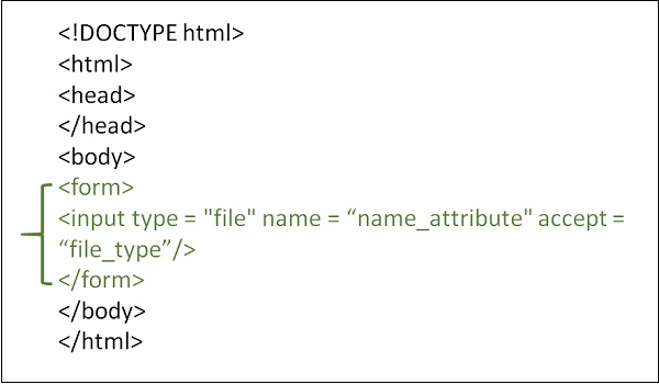 <!DOCTYPE html> <html> <head> <title>File Upload</title> </head> <body> <form> <input type = "file" name = "upload" accept = "image/*" /> </form> </body> </html>