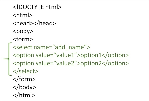 <!DOCTYPE html> <html> <head> <title>Select Box Control</title> </head> <body> <p>Here's the list of subjects. Select any one:</p> <form> <select name = "dropdown"> <option value = "Computer Architecture" selected>Computer Architecture</option> <option value = "Java">Java</option> <option value = "Discrete Mathematics">Discrete Mathematics</option> </select> </form> </body> </html>