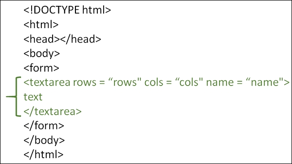 <!DOCTYPE html> <html> <head> <title>HTML textarea Tag</title> </head> <body> <form action = "/cgi-bin/hello_get.cgi" method = "get"> What improvements you want in College? <br> <textarea rows = "5" cols = "60" name = "description"> Enter details here... </textarea><br> <input type = "submit" value = "submit" /> </form> </body> </html>