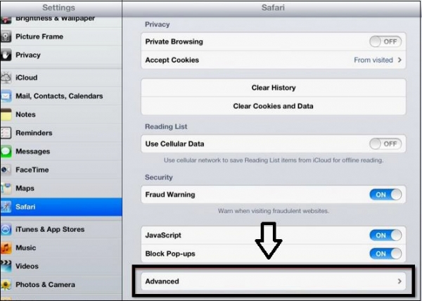 現在啟用 iOS 中的網頁檢查器。在設定應用中,選擇Safari。輕觸高階選項並啟動網頁檢查器 −