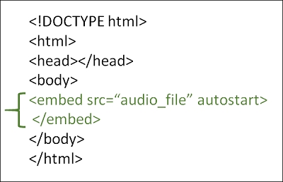 若要給網頁新增背景音樂,使用 <embed>…</embed> 元素。同時,使用自動播放屬性。這會在網頁載入時在後臺播放音樂。