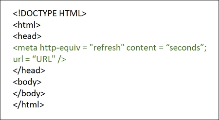 <!DOCTYPE html> <html> <head> <title>HTML Meta Tag</title> <meta http-equiv = "refresh" content = "2; url = https://tutorialspoint.tw" /> </head> <body> <p>Hello HTML5!</p> </body> </html>
