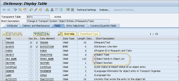 要開啟任何表格,您可以使用 T 程式碼:SE11 輸入表格 E071。您可以透過 PGMID、OBJECT 和 OBJ_NAME 對網格顯示中的結果進行分組。