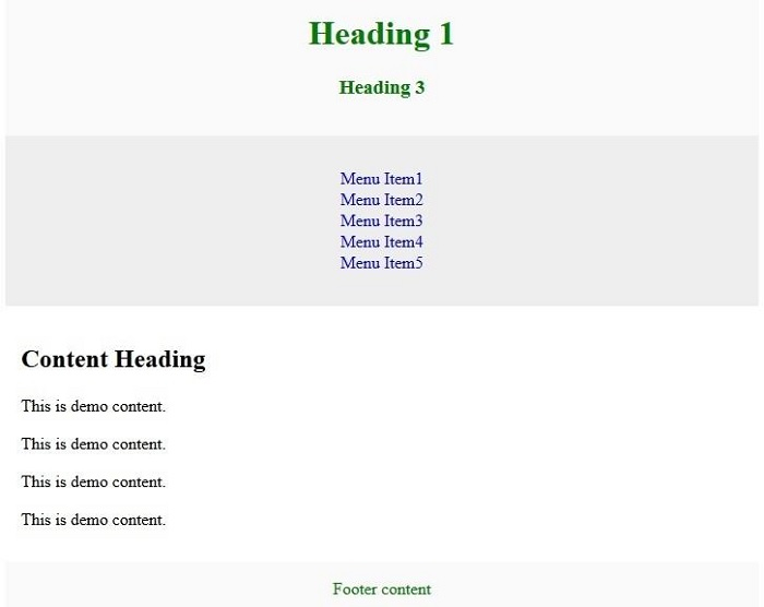 <!DOCTYPE html> <html> <head></head> <body> <div class="mycontent"> <header> <h1>Tutorialspoint.com</h1> <h3>Simply Easy Learning</h3> </header> <nav> <ul> <li><a href="/tutorialslibrary.htm">Tutorials Library</a></li> <li><a href="/videotutorials/index.htm">Video Tutorials</a></li> <li><a href="/codingground.htm">Coding Ground</a></li> <li><a href="/tutor_connect/index.php">Tutor Connect</a></li> <li><a href="/online_dev_tools.htm">Tools</a></li> </ul> </nav> <article> <h1>About Us</h1> <p>This is demo content.</p> <p>This is demo content.</p> <p>This is demo content.</p> <p>This is demo content.</p> </article> <footer>Add the footer content here</footer> </div> </body> </html>