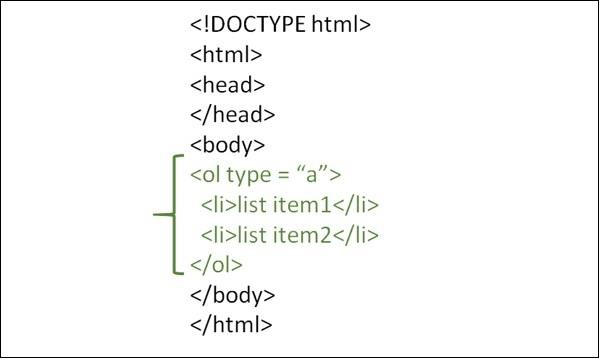 <ol type="a"> <li>Item in list…</li> <li>Item in list…</li> <li>Item in list…</li> </ol>