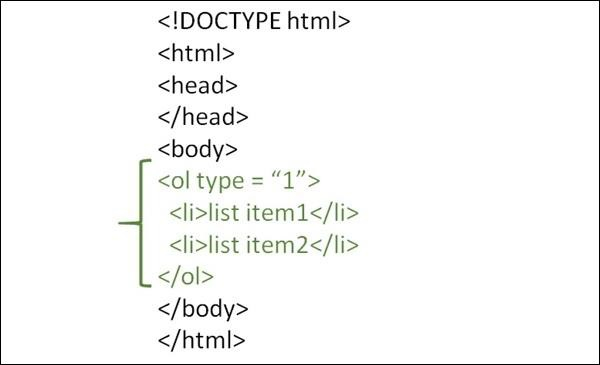 以下是使用 HTML 建立編號為數字的有序列表項的語法。