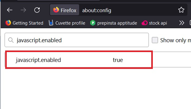 步驟 3 − 在頁面頂部的搜尋欄位中,輸入 javascript.enabled。在這裡,您可以看到該值為 true,這表明 JavaScript 在瀏覽器中已啟用。