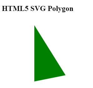 <!DOCTYPE html> <html> <head> <style> #svgelem { position: relative; left: 10%; -webkit-transform: translateX(-20%); -ms-transform: translateX(-20%); transform: translateX(-20%); } </style> <title>HTML5 SVG Polygon</title> </head> <body> <h2>HTML5 SVG Polygon</h2> <svg id="svgelem" width="300" height="300" xmlns="http://www.w3.org/2000/svg"> <polygon points="100, 20 200,180 100,200" style="fill:green;" /> </svg> </body> </html>