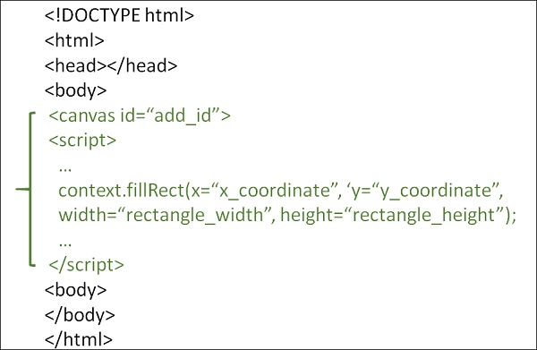 <!DOCTYPE html> <html> <head> <title>HTML5 Canvas Tag</title> </head> <body> <canvas id="newCanvas" width="200" height="100" style="border:1px solid #000000;"></canvas> <script> var c = document.getElementById('newCanvas'); var ctx = c.getContext('2d'); ctx.fillStyle = '#7cce2b'; ctx.fillRect(0,0,300,100); </script> </body> </html>
