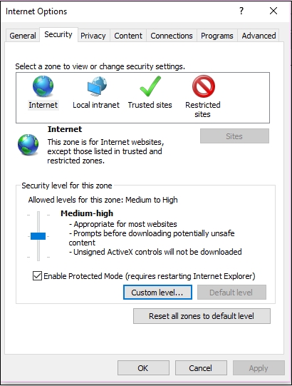 現在,將開啟一個對話方塊。轉到安全選項卡,然後單擊自定義級別。