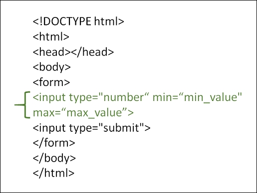 <!DOCTYPE html> <html> <head> <title>HTML input number</title> </head> <body> <form action = "" method = "get"> Mention any number between 1 to 10 <input type="number" name="num" min="1" max="10"><br> <input type="submit" value="Submit"> </form> </body> </html>