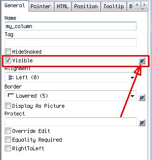 您只需設定與可見性屬性繫結的表示式。轉到資料視窗並選擇您需要顯示/隱藏的所需列。然後轉到屬性並檢視“可見”複選框,然後單擊突出顯示的按鈕。