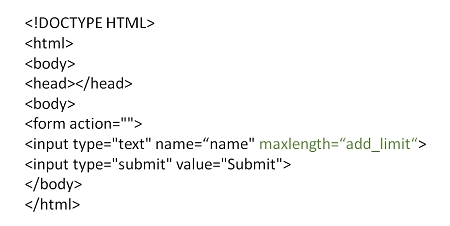 <!DOCTYPE html> <html> <head> <title>HTML maxlength attribute</title> </head> <body> <form action=""> Student Name<br><input type="text" name="name" maxlength="20"><br><br> <input type="submit" value="Submit"> </form> </body> </html>