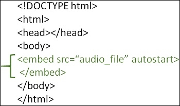 <!DOCTYPE html> <html> <head> <title>HTML background music</title> </head> <body> <p>The music is running in the background.</p> <p>(Song: Kalimba which is provided as a Sample Music in Windows)</p> <embed src="/html/Kalimba.mp3" loop="true" autostart="true" width="2" height="0"> </body> </html>
