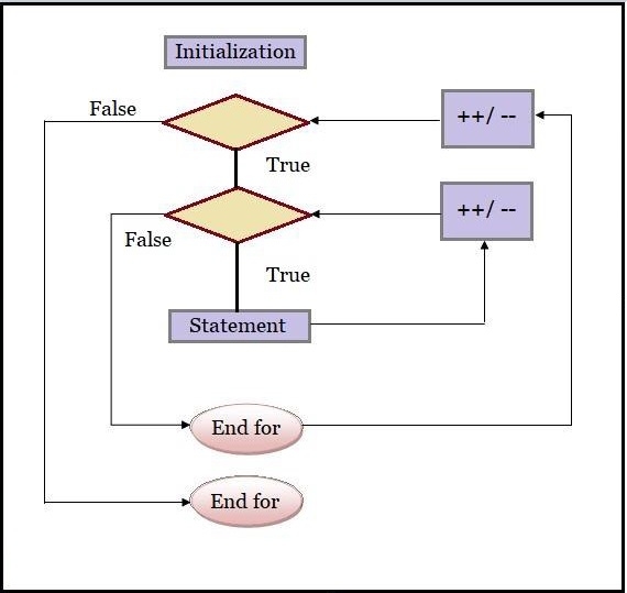 “for 迴圈”包括初始化、測試語句和迭代語句。你可以嘗試執行以下程式碼以在流程圖中顯示巢狀“for 迴圈” −