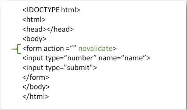 <!DOCTYPE html> <html> <head> <title>HTML novalidate attribute</title> </head> <body> <form action = "" method = "get" novalidate> Student Name<br><input type="name" name="sname"><br> Rank<br><input type="number" name="rank"><br> <input type="submit" value="Submit"> </form> </body> </html>
