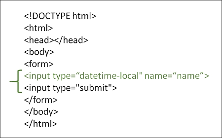 <!DOCTYPE html> <html> <head> <title>HTML input datetime</title> </head> <body> <form action = "" method = "get"> Details:<br><br> Student Name<br><input type="name" name="sname"><br> Exam Date and Time<br><input type="datetime-local" name="datetime"><br> <input type="submit" value="Submit"> </form> </body> </html>