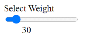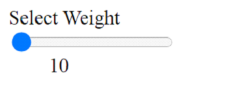 <html> <body> <form oninput="res.value = slider1.value"> <label>Select Weight</label><br> <input type="range" name="slider1" min="10" max="200" step="10" value="30"> <br/> <output name="res" for="slider1">30</output> </form> </body> </html>