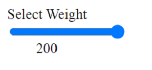 <html> <body> <form name="form1"> <label>Select Weight</label><br> <input type="range" name="weight" min="10" max="200"> </form> </body> </html>