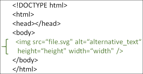 .svg 檔案需要在 <img> 標記的 src 屬性中引用。讓我們看看如何使用 <img> 標記進行新增。