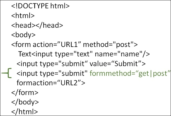 <!DOCTYPE html> <html> <head> <title>HTML formmethod attribute</title> </head> <body> <form action=”/new.php” method="get"> Student Name<br><input type="text" name="name"/><br> Student Subject<br><input type="text" name="subject"/><br> <input type="submit" value="Submit"> <input type="submit" formmethod=”post” formaction=”/new2.php” value="Submit"> </form> </body> </html>