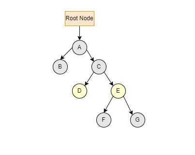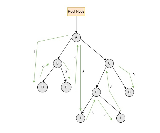 遍歷從根節點A開始,並檢查根節點A是否有左子樹。由於存在,它移動到左子樹B。在B之後沒有子樹,將遍歷A(根節點)並轉到右子樹C以檢查其是否有左子樹。此過程將持續進行,直到遍歷所有節點。