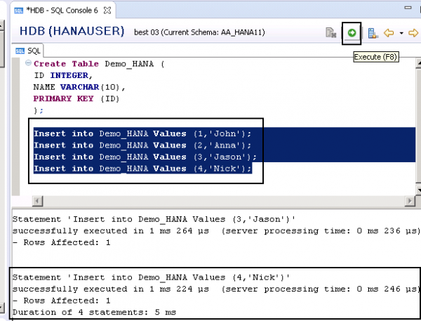 Insert into Demo_HANA Values (1,'John'); Insert into Demo_HANA Values (2,'Anna'); Insert into Demo_HANA Values (3,'Jason'); Insert into Demo_HANA Values (4,'Nick');