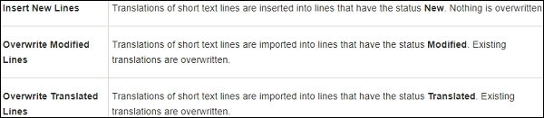 您可以使用“短文字特定選項”分組框,組合使用任何複選框來指定是否僅將翻譯後的短文字插入系統(不會覆蓋現有翻譯後的短文字),或者是否用新翻譯覆蓋修改或翻譯的行。