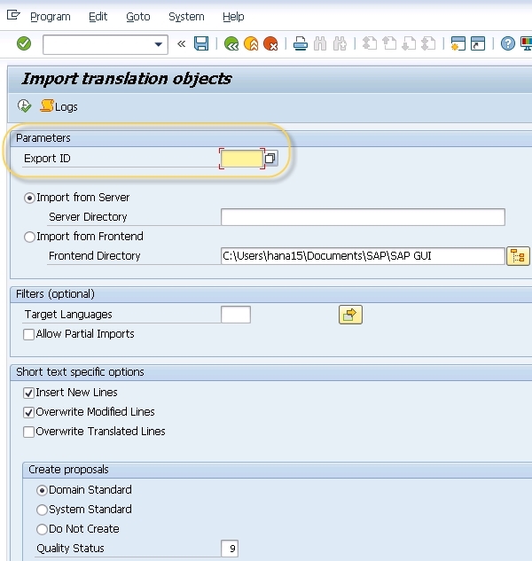 使用事務程式碼 LXE_Master,您可以匯入先前為離線翻譯匯出的短文字和 PDF 表單的翻譯。匯入過程中,您可以在建議池中建立建議。