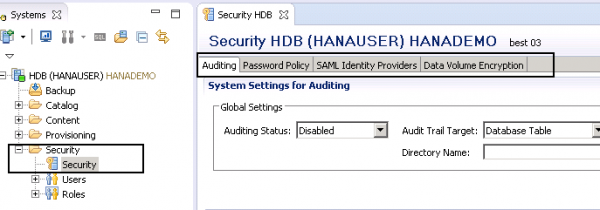 SAP HANA Studio 系統導航中的最後一個資料夾是安全,其中有 3 個子資料夾,用於定義系統安全策略和使用者管理活動 −