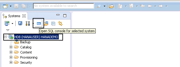當您在 HANA Studio 下新增一個新的系統時,以下螢幕會顯示可用於管理 HANA 系統的不同資料夾。要開啟 SQL 編輯器,您必須選擇 HANA 系統並單擊頂部的 SQL 按鈕。