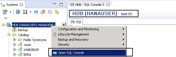 您還可以透過右鍵單擊 HANA 系統 HDB → 開啟 SQL 控制檯來開啟 SQL 控制檯。當控制檯開啟後,您可以在頂部看到主機名和例項號,以及將建立資料庫物件的架構名稱。