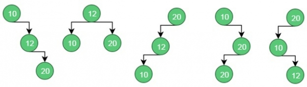 Input: The key values as node and the frequency. Keys = {10, 12, 20} Frequency = {34, 8, 50} Output: The minimum cost is 142. These are possible BST from the given values.For case 1, the cost is: (34*1) + (8*2) + (50*3) = 200 For case 2, the cost is: (8*1) + (34*2) + (50*2) = 176. Similarly for case 5, the cost is: (50*1) + (34 * 2) + (8 * 3) = 142 (Minimum)