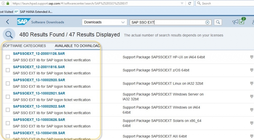 可以從 SAP 服務市場 http://service.sap.com/swdc 下載 SAP SSO EXT 庫,然後在此處搜尋 SAPSSOEXT。