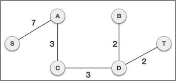 此步驟後,將形成 S-7-A-3-C 樹。現在,我們將再次將其視為一個節點,並將再次檢查所有邊。但是,我們只選擇成本最低的邊。在本例中,C-3-D 是新的邊,它小於其他邊的成本 8、6、4 等。